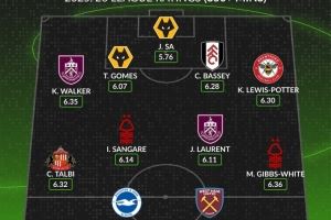 中场:塔尔比(桑德兰)、桑加雷(诺丁汉森林)、劳伦特(伯恩利)、吉布斯-怀特(诺丁汉森林)